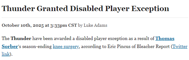 雷霆因索伯赛季报销获伤病球员特例 该特例价值超230万美元