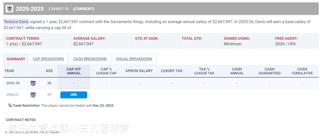 但我们会发现特伦斯-戴维森的合同细节很模糊,他并不是一份全额的保障性合同,国王队也从未披露过他的合同细节,根据NBA记者肯尼-史密斯的报道,戴维森很可能跟国王签下的是Exhibit10合同,国王可以在新赛季开启前裁掉他,让他去发展联盟代表国王打球。