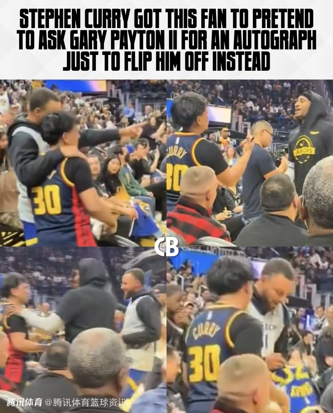 库里安排一位身着30号球衣的球迷假装找小佩顿要签名,然后对他做不敬手势,小佩顿上当后库里大笑,随后给这位球迷送去自己的亲签球衣。