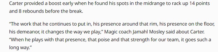莫斯利称赞了小温德尔-卡特的出色发挥(此役得到20分13篮板3助攻1盖帽),他说道:“卡特持续付出的努力、在篮筐附近的存在感、在场上的影响力以及他的比赛态度,都改变了我们的打法,当他带着这样的气场、沉稳的心态和强大的实力为球队征战时,能给球队带来极大的帮助。”
