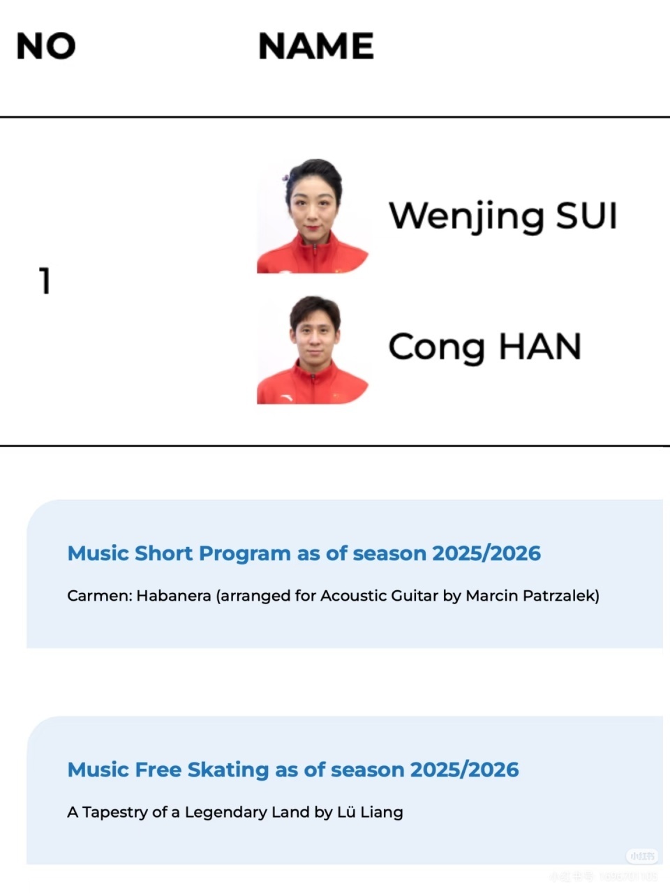 2025-10-11 15:50根据国际滑联官网更新信息,北京冬奥会花样滑冰双人滑冠军、中国组合隋文静/韩聪在25/26赛季的两套节目选曲公布:短节目选自歌剧《卡门》;自由滑配乐为舞剧《只此青绿》。