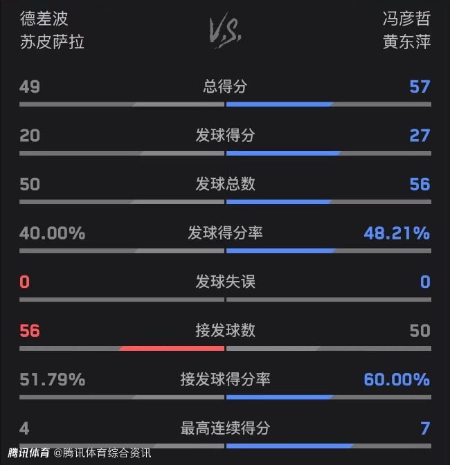 双方技术统计如下(凤凰组合在前):总得分57-49、发球得分27-20、发球得分率48.21%-40.00%。