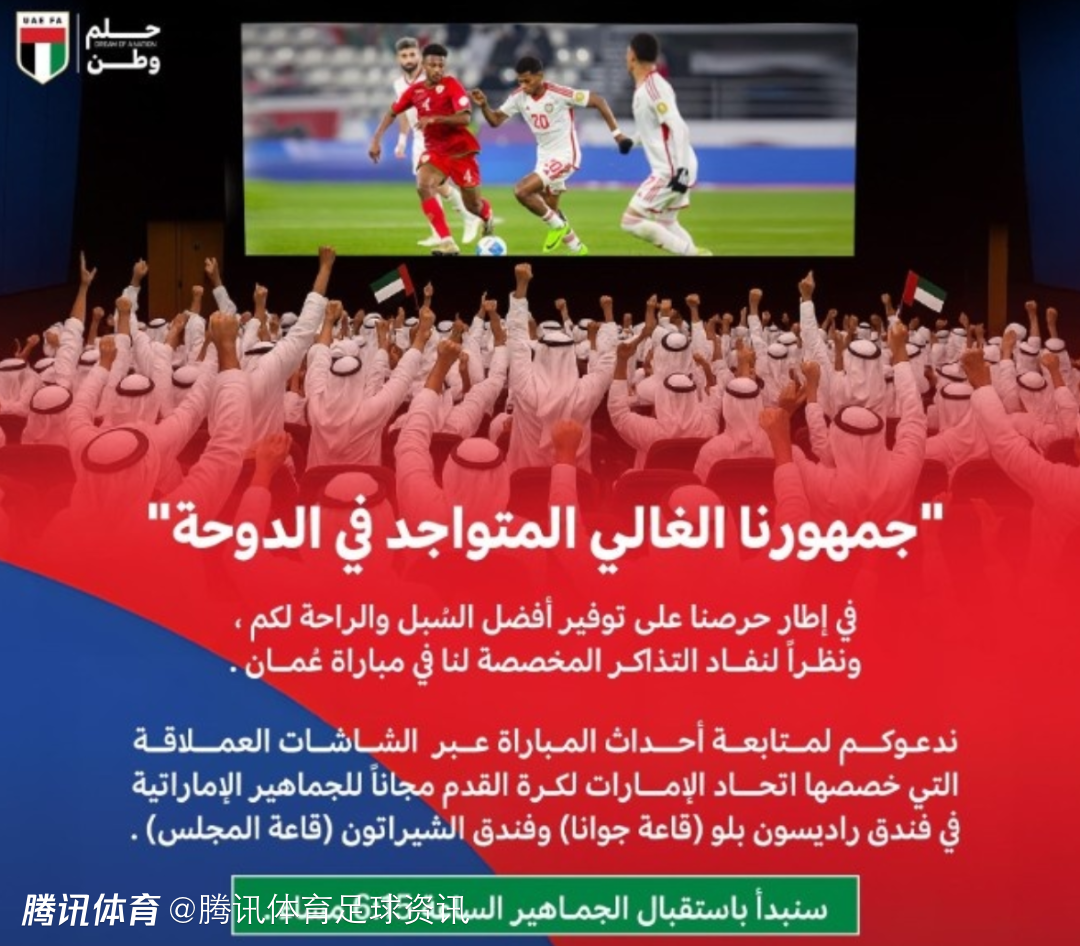 阿联酋足协官方随之宣布,将在两家酒店设置大型屏幕,免费向球迷开放观看世预赛赛事直播。