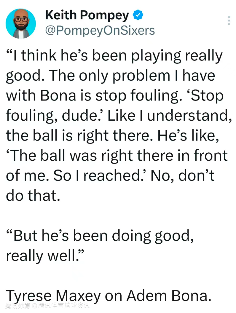 马克西说道:“我觉得他打得非常棒。我对博纳唯一的要求就是别再犯规了。我反复强调别犯规了,兄弟。他总是说他懂,但球就在那儿,就在他面前,所以他就伸手了。这真的不行,不能这么做。但他整体表现很好,非常好。”博纳最终在本场比赛中领到3次犯规。