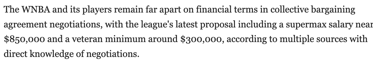 2025-10-11 21:30北京时间10月11日,据多名消息人士透露,WNBA联盟与球员在劳资协议(CBA)的财务条款上仍存在巨大分歧。联盟最新提案中,超级顶薪薪资接近85万美元,老将底薪约为30万美元。