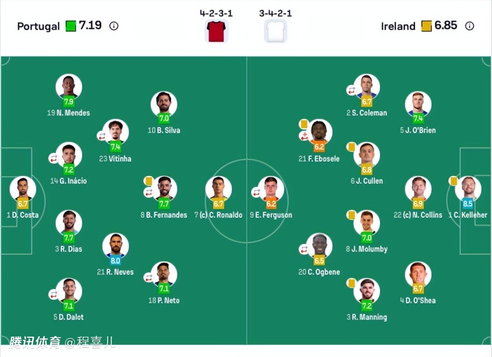 葡萄牙首发:1-迪奥戈·科斯塔、3-鲁本·迪亚斯、5-达洛特(61’16-特林康)、7-C罗、8-B费(86’9-贡萨洛·拉莫斯)、10-B席、14-伊纳西奥(46’13-维加)、18-内托(61’17-莱奥)、19-努诺·门德斯、21-鲁本·内维斯、23-维蒂尼亚(61’2-塞梅多)。