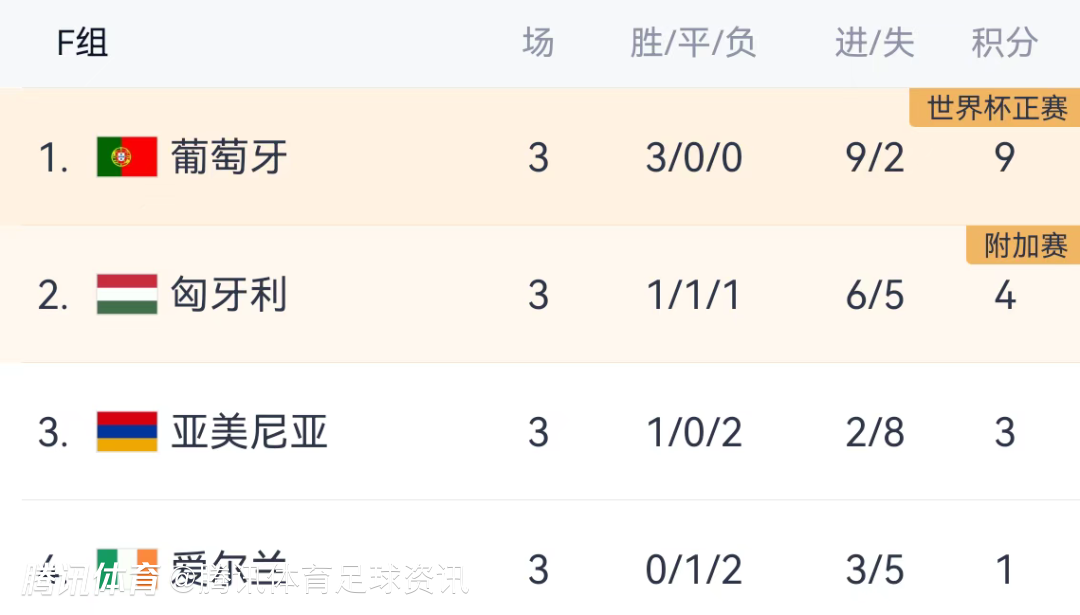 赛后,积分榜情况,葡萄牙3连胜积9分,排名第一;匈牙利4分第二、亚美尼亚3分第三、爱尔兰只有1分排名垫底。