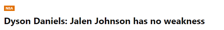 戴森-丹尼尔斯说道:“这太棒了。杰伦-约翰逊是位非常出色的球员,他为球队提供了巨大帮助。他能力全面,能抢篮板、能防守、能推进快攻,还能得分。他就是那种全能型球员,球风几乎没有短板。所以,有他在场上会让我们球队变得更强,我们也很期待他的回归。希望新赛季我们能全员保持健康。”