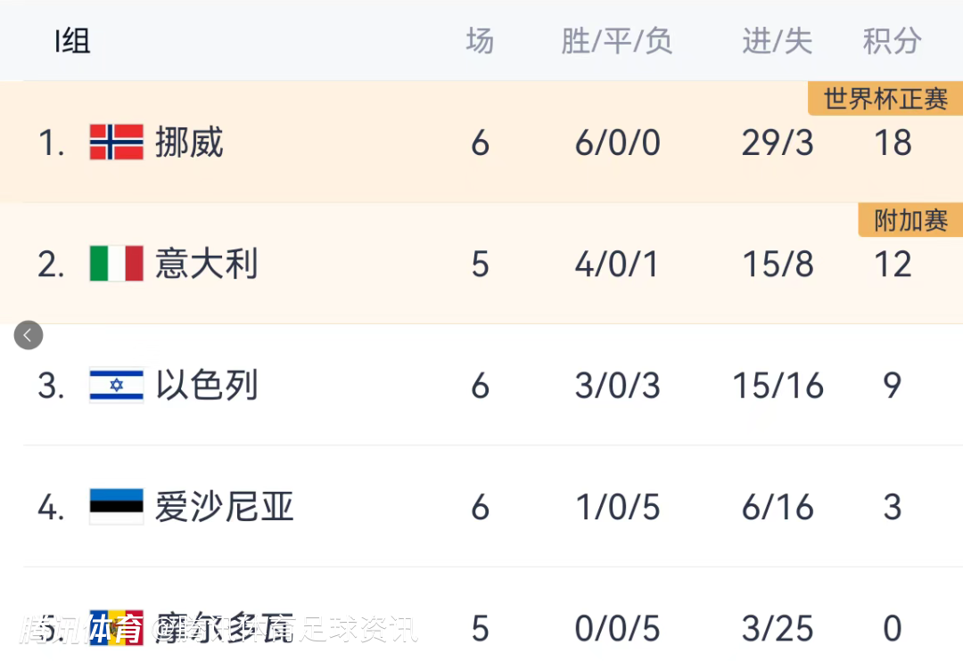 2025-10-12 08:10北京时间10月12日,世预赛欧洲区小组赛I组第7轮,意大利3-1战胜爱沙尼亚,挪威5-0大胜以色列。