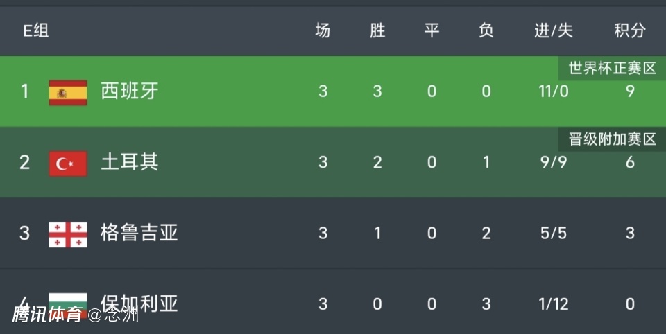西班牙3战全胜9分领跑,土耳其2胜1负6分,格鲁吉亚3分,保加利亚0分。西班牙下轮对阵保加利亚,4连胜问题不大,最后一轮对阵土耳其,打平就能出线。