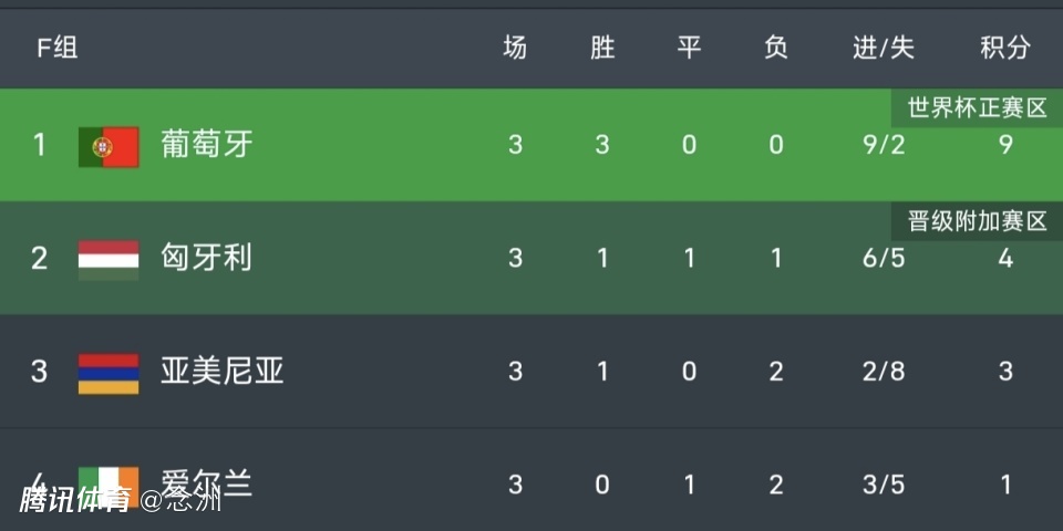 葡萄牙3战全胜9分领跑,下轮只要击败4分的小组第二匈牙利,就能提前晋级世界杯,亚美尼亚3分,还能争夺附加赛名额。