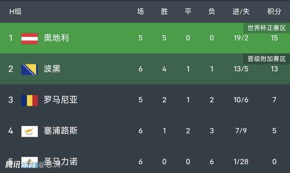 5队小组,奥地利5连胜15分,波黑13分但是多赛1场,所以前者直通世界杯的机会很大。塞浦路斯7分已经提前出局,圣马力诺虽然0分垫底,但可能通过欧国联拿到附加赛门票。