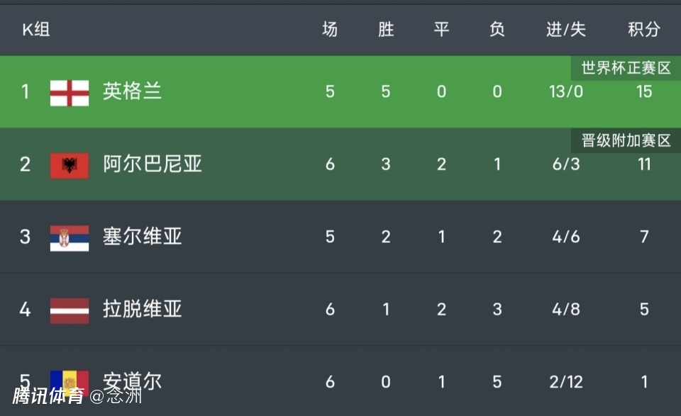 5队小组,英格兰本轮轮空,5战全胜15分,少赛1场领先第二名阿尔巴尼亚4分,出线形势占优。塞尔维亚少赛1场7分,也有机会竞争附加赛名额,安道尔1分彻底出局。