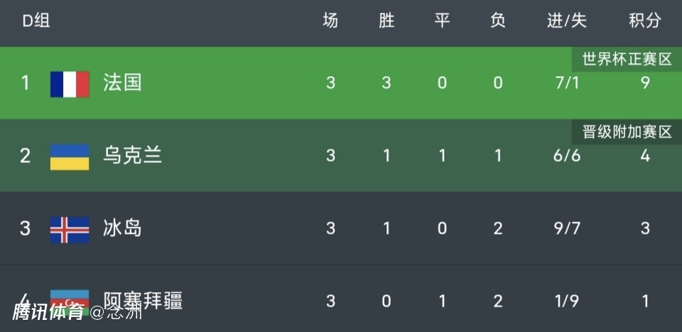 法国3战全胜9分领跑,直通世界杯几乎没有悬念。乌克兰4分,冰岛3分,将争夺附加赛名额,其中冰岛下轮对阵法国,形势不利。