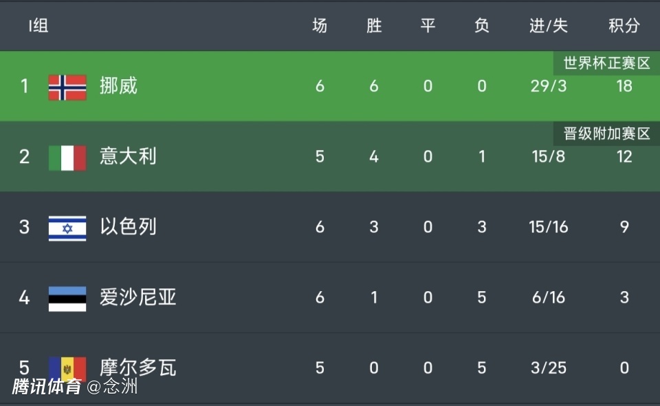 5队小组,挪威6战全胜18分领跑,意大利少赛1场积12分,落后6分,而两队直到最后一轮才交手,所以意大利很可能连续三届踢附加赛。以色列6战9分已经无缘直通,争夺小组第二。爱沙尼亚3分彻底出局,摩尔多瓦0分垫底,但可能通过欧国联拿到附加赛资格。