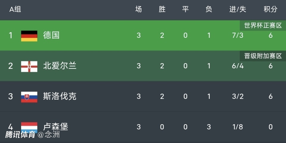 德国和北爱尔兰都是2胜1平,同积6分,净胜球多2个,下轮两队将直接较量,胜者基本上就将晋级世界杯。