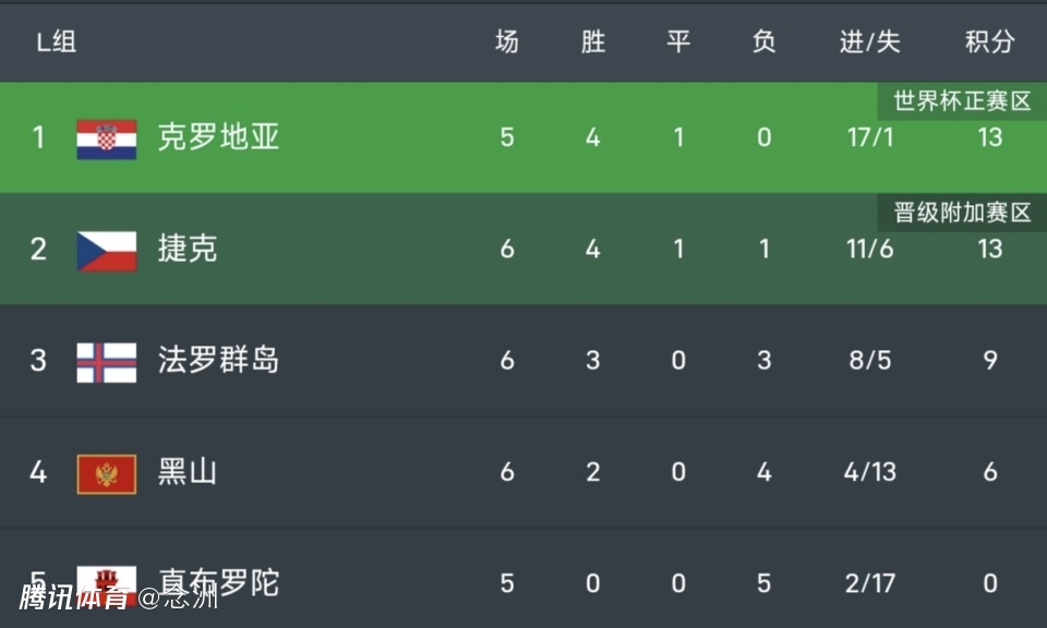 5队小组,克罗地亚和捷克都是13分,前者净胜球多了11个,法罗群岛9分,已经基本没有希望。黑山6分,直布罗陀0分,都彻底出局。