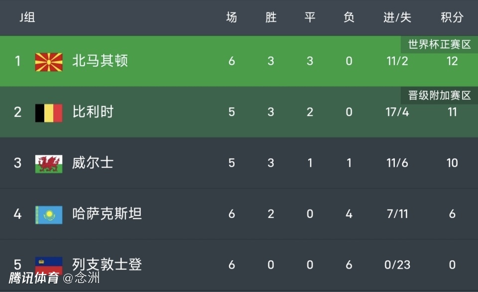 5队小组,北马其顿6轮12分,比利时少赛1场11分,威尔士少赛1场10分,3队都有机会。下轮威尔士和比利时强强对话,胜者将在竞争中占据优势,列支敦士登0分彻底出局。
