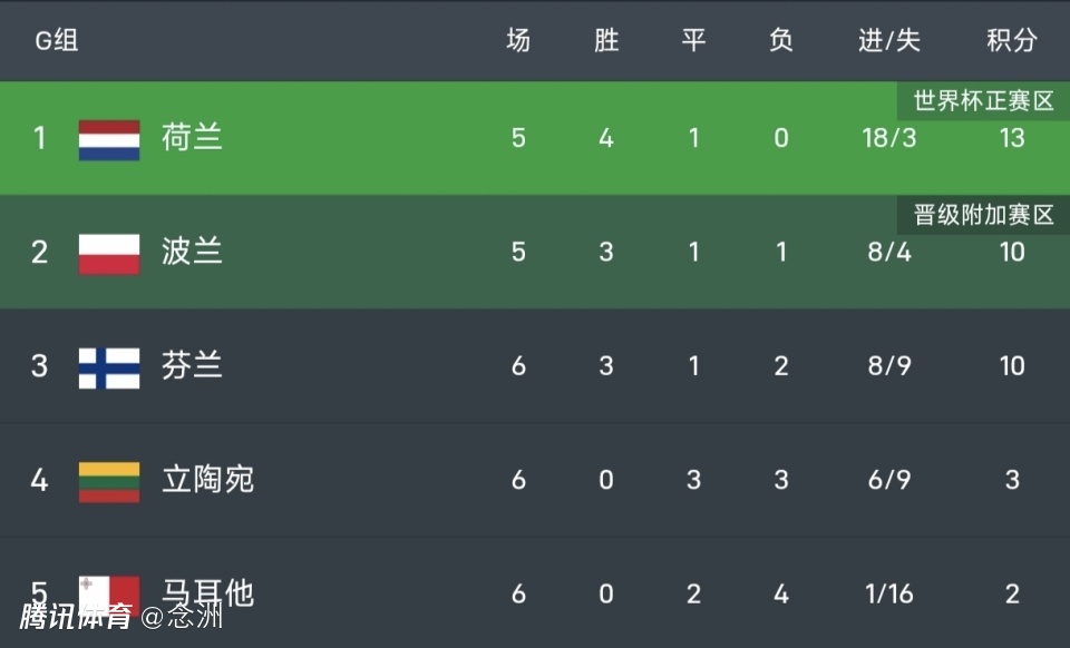 5队小组,荷兰4胜1平13分,但波兰和芬兰都是10分,未来两轮,荷兰接连对阵芬兰、波兰,这两场比赛将决定直通世界杯和附加赛名额的归属。立陶宛3分,马耳他2分,已经确定无缘世界杯。
