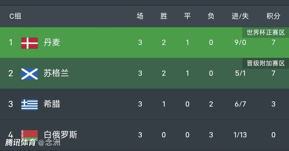 丹麦和苏格兰都是2胜1平,同积7分,前者净胜球多了5个,希腊3分,白俄罗斯垫底。下轮丹麦将对阵希腊,苏格兰迎战白俄罗斯,有望继续赢球。而最后一轮丹麦和苏格兰的直接较量,将决出直通世界杯的名额。