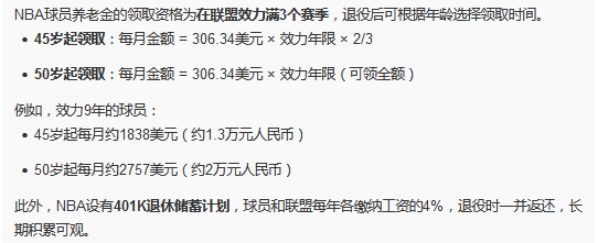 根据NBA规则,打满3年就可以领取最低标准,职业生涯超过10年就可以按最高标准拿退休金。并且这笔钱是以“年金”的方式进行计算与发放的,非“按月发放”的形式。