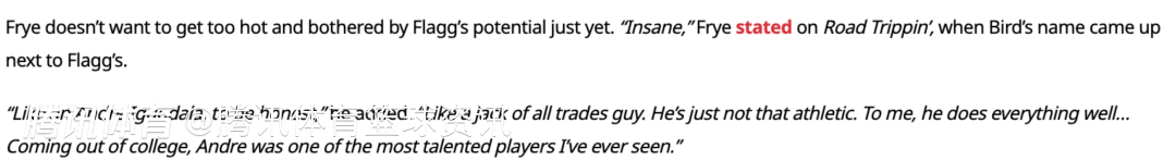 弗莱表示:“这种对比太夸张了,说实话,他更像伊戈达拉,就是那种‘万金油’型球员。他的运动能力不算顶尖,但在我看来,他每件事都能做得很好,伊戈达拉刚从大学出来时,是我见过最有天赋的球员之一。”