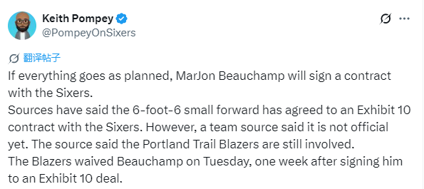 消息人士透露,这位小前锋已同意与76人队签订一份Exhibit 10合同。不过,一位球队内部消息人士表示,此事目前尚未正式敲定。该消息人士还称,开拓者队仍在参与相关事宜。