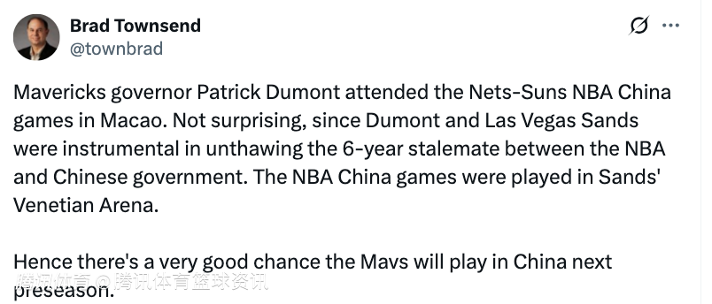 Brad Townsend表示,杜蒙特出现在澳门并不意外,因为杜蒙特和拉斯维加斯金沙集团在促成NBA与中国方面之间长达6年的僵局破冰中起到了关键作用。此次NBA中国赛就在金沙旗下的威尼斯人体育馆举行。因此,独行侠也被认为极有可能会在明年的季前赛前往中国打比赛。