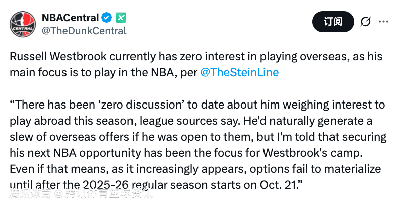 2025-10-13 10:40北京时间10月13日,据名记Marc Stein报道,自由球员威少目前无意去海外联赛打球,专注回归NBA。