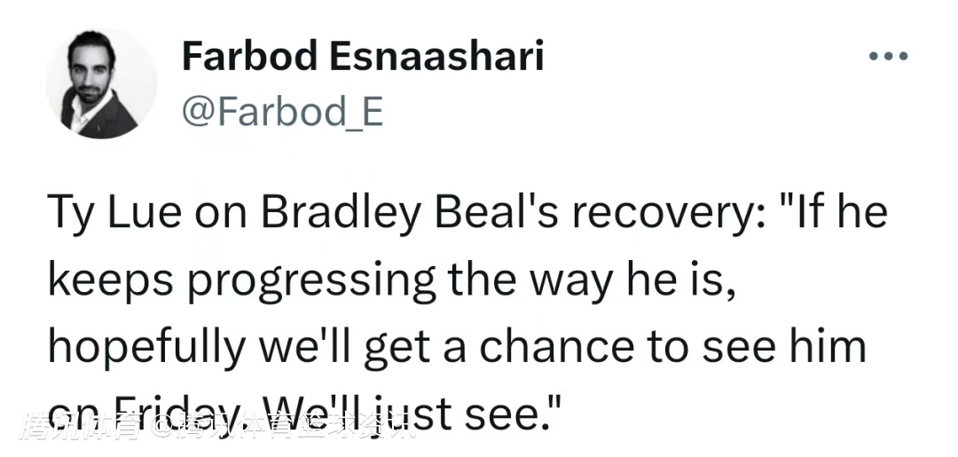 谈及队内球员比尔的恢复进度,泰伦-卢表示:“如果继续按照目前的恢复节奏,比尔有望在对阵勇士时复出。让我们拭目以待吧。”比尔上赛季出战53场比赛,场均上场32.1分钟,场均贡献17.0分3.3篮板3.7助攻1.1抢断0.5盖帽,投篮命中率49.7%,三分球命中率38.6%,罚球命中率80.3%。