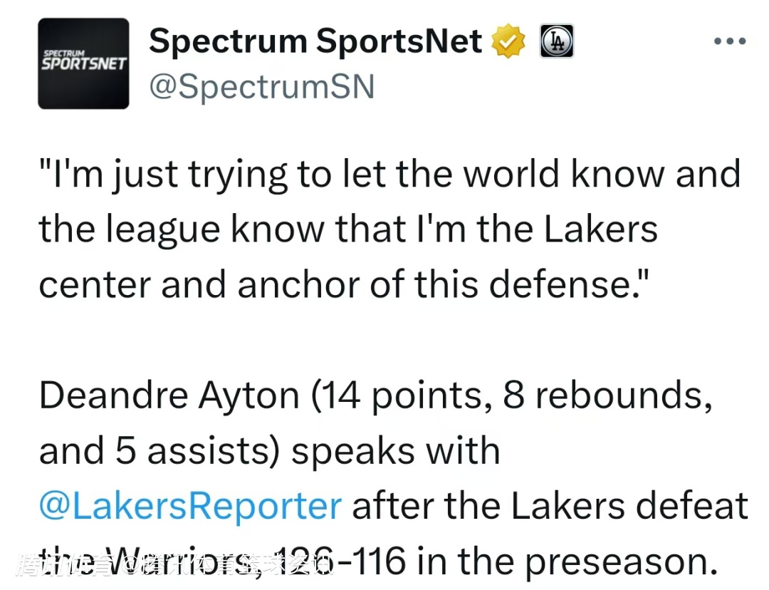 艾顿在谈到自己的表现时表示:“我只是想向世界和联盟宣告,我是湖人队的中锋,并且会成为这支球队防守端的核心。”