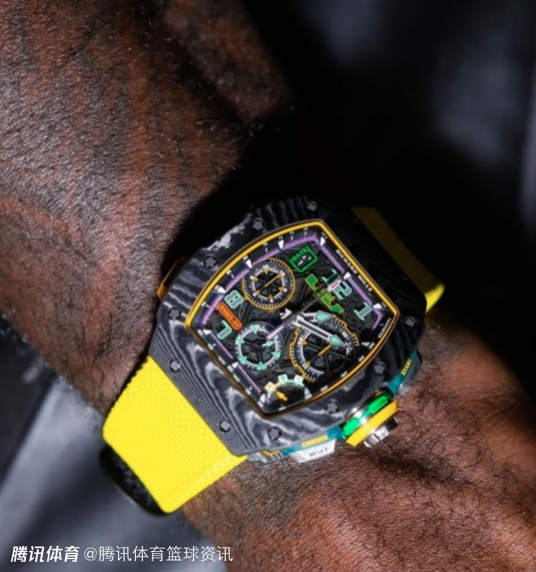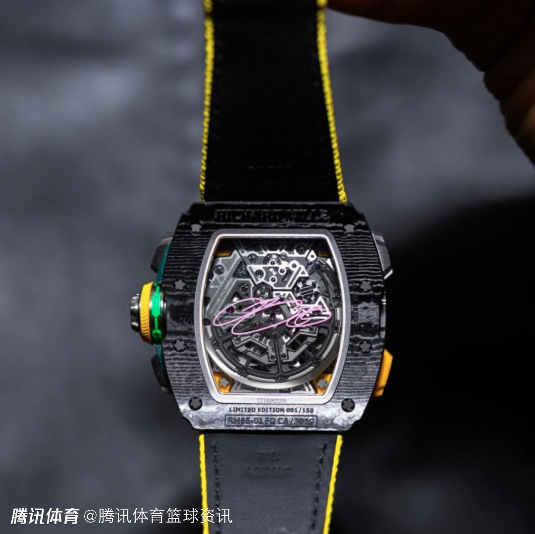 据悉,这款腕表是理查米尔为詹姆斯打造的限量150枚的RM65-01腕表,而詹姆斯本人则晒出了限量150枚中编号为1的那一枚。腕表表面12点位置有詹姆斯的皇冠Logo,后表壳则有他的签名。类似詹姆斯这款钛金属材质普通版本的售价大约在38万美元,不过詹姆斯这一联名款售价为45万美元,二级市场为55万美元。