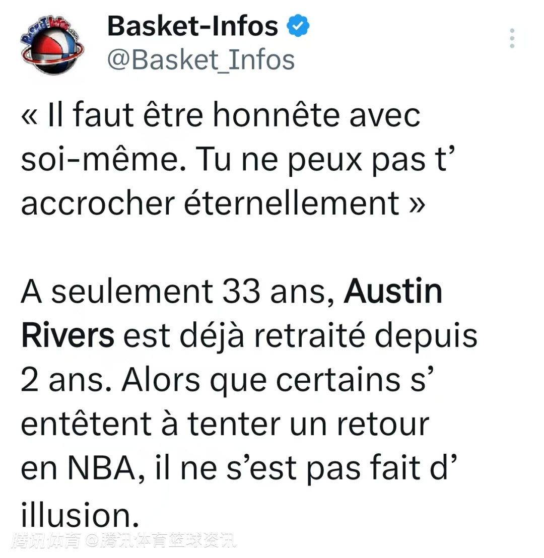2025-10-13 20:50北京时间10月13日,前NBA球员奥斯汀-里弗斯在接受采访时,谈及自己放弃重返NBA的决定。年仅33岁的小里弗斯已经退役两年了。当一些人仍执意尝试重返NBA时,他却没有抱有幻想。