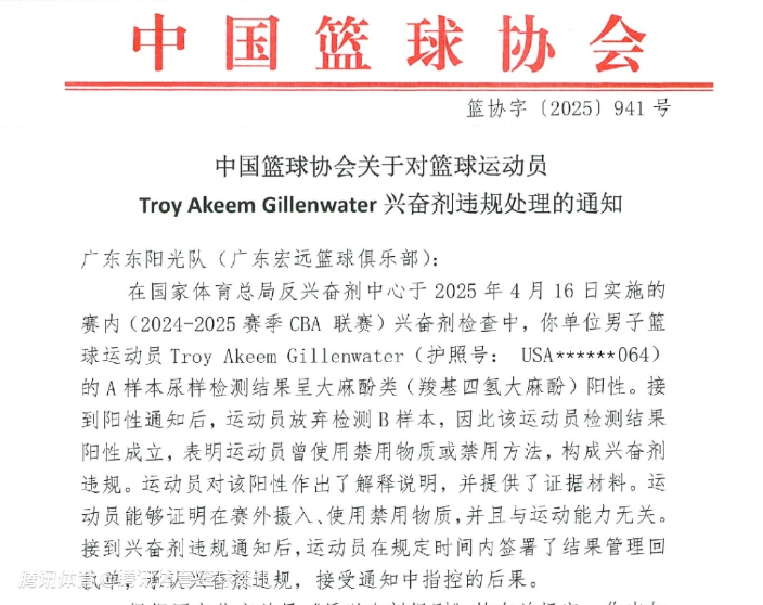 中国篮协在给广东东阳光队(广东宏远篮球俱乐部)下发的通知中说:“在国家体育总局反兴奋剂中心于2025年4月16日实施的赛内(2024-2025赛季CBA)兴奋剂检查中,你单位男子篮球运动员Troy Akeem Gillenwater(吉伦沃特)的A样本尿样检测结果呈大麻酚类(羧基四氢大麻酚)阳性。接到阳性通知后,运动员放弃检测B样本,因此该运动员检测结果阳性成立,表明运动员曾使用禁用物质或禁用方法,构成兴奋剂违规。运动员对该阳性作出了解释说明,并提供了证据材料。运动员能够证明在赛外摄入、使用禁用物质,并且与运动能力无关。接到兴奋剂违规通知后,运动员在规定时间内签署了结果管理回执单,承认兴奋剂违规,接受通知中指控的后果。”