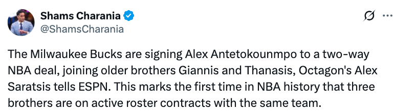 2025-10-14 00:20北京时间10月14日,据名记Shams报道,雄鹿将与亚历克斯-阿德托昆博签下一份双向合同,他将和他的哥哥扬尼斯和萨纳西斯并肩作战。这标志着NBA历史上首次有三兄弟同时在同一支球队的现役名单中效力。