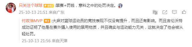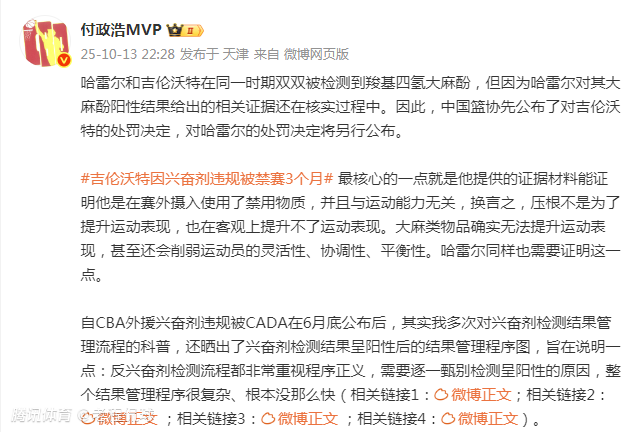 对此,媒体人付政浩表示:“吉伦沃特因兴奋剂违规被禁赛3个月最核心的一点就是他提供的证据材料能证明他是在赛外摄入使用了禁用物质,并且与运动能力无关。”