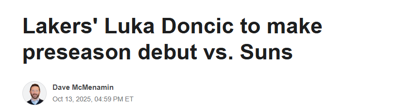 2025-10-14 07:00北京时间10月14日,湖人队主帅雷迪克宣布,东契奇将在明日(北京时间10月15日)客场对阵菲尼克斯太阳队的比赛中完成季前赛首秀。