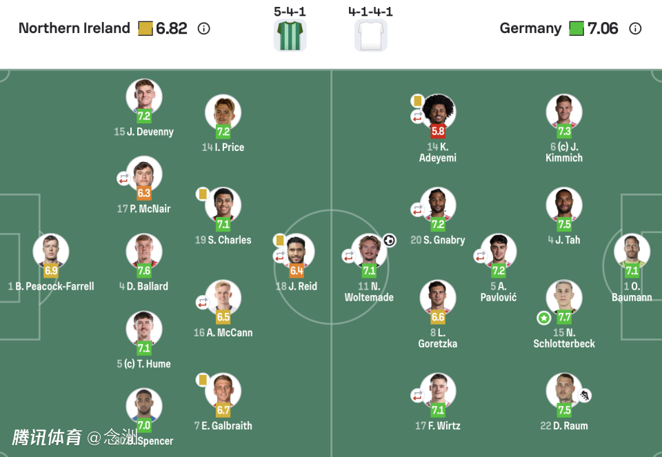 德国:1-鲍曼;6-基米希,15-施罗特贝克,4-塔,22-劳姆;5-帕夫洛维奇;14-阿德耶米,8-格雷茨卡,20-格纳布里,17-维尔茨;11-沃尔特马德
