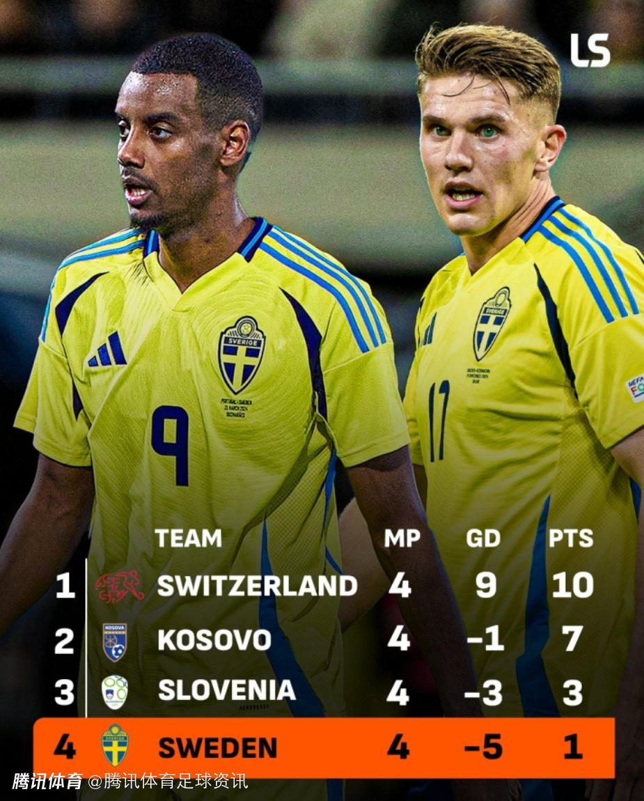 瑞典世预赛已4轮不胜,且在拥有总身价1.95亿的两大神锋伊萨克和约克雷斯的情况下,近3轮都未攻获进球,目前暂以1分垫底,落后榜首瑞士9分,落后第2的科索沃6分。