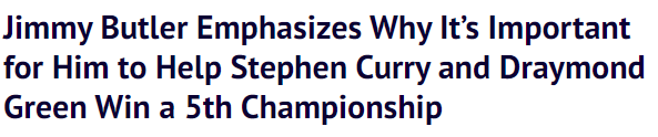 巴特勒说道:“夺冠对我来说意义非凡。但如果他们(库里和追梦)能夺冠,对我来说同样意义重大。我们都知道,他们早已在篮球名人堂和联盟中奠定了地位,但要想与其他人拉开差距,拿到5个总冠军,他们就真正站在了那个顶尖位置。”