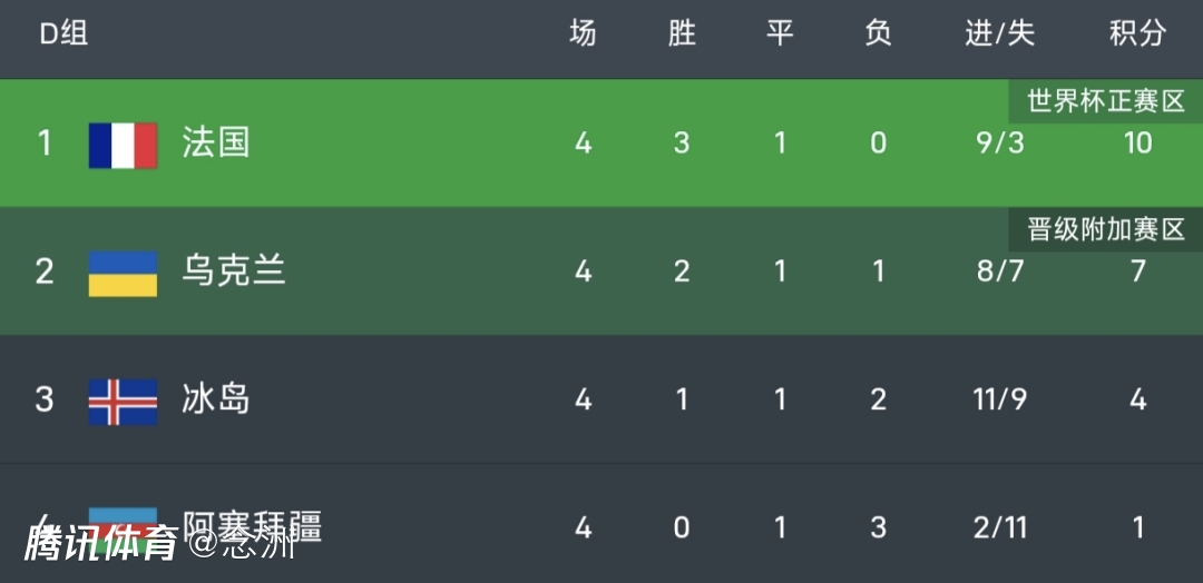 法国10分领跑,乌克兰7分,下轮两队直接交锋,法国赢球就进世界杯。冰岛4分,还有附加赛的机会,阿塞拜疆1分垫底。