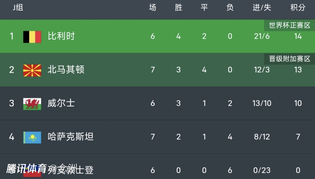 5队小组,竞争激烈,比利时少赛1场14分,下轮赢哈萨克斯坦就出线。北马其顿13分,威尔士少赛1场10分,下轮两队直接交锋,争夺附加赛资格。哈萨克斯坦7分,列支敦士登0分,双双出局。