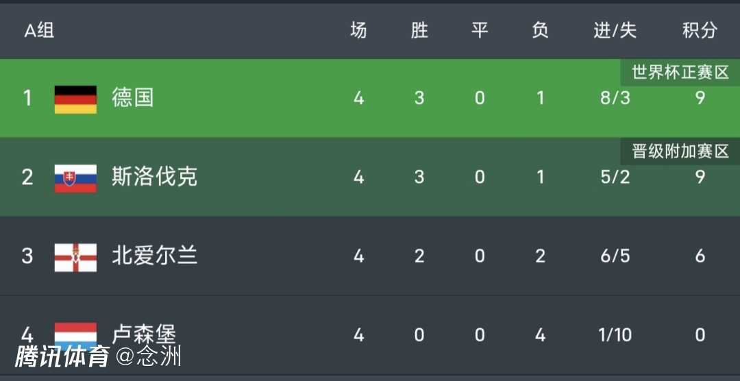 德国和斯洛伐克都是9分,前者多了2个净胜球,位居榜首,下轮对阵卢森堡,最后一轮将与斯洛伐克直接交锋。北爱尔兰6分,下轮对阵斯洛伐克,输球无缘世界杯。卢森堡0分已经提前出局。