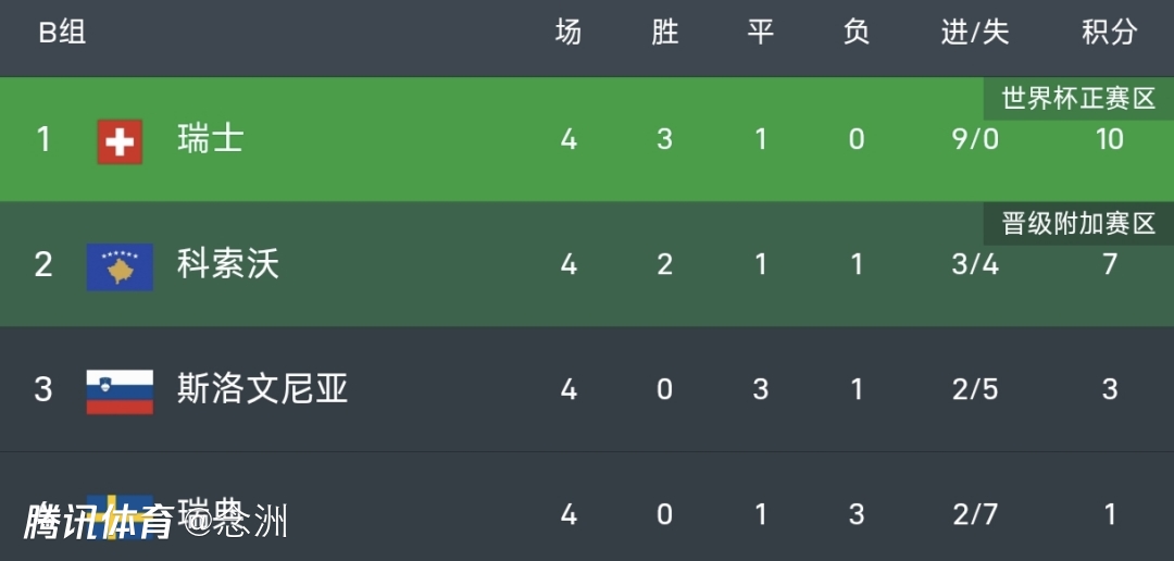 瑞典4轮1平3负1分垫底,已确定无缘直通世界杯,下轮对阵瑞士,不胜就彻底无缘世界杯,赢球也可能出局。7分的科索沃下轮对阵3分的斯洛文尼亚,打平就锁定附加赛。瑞士10分居首,下轮赢瑞典出线在望。