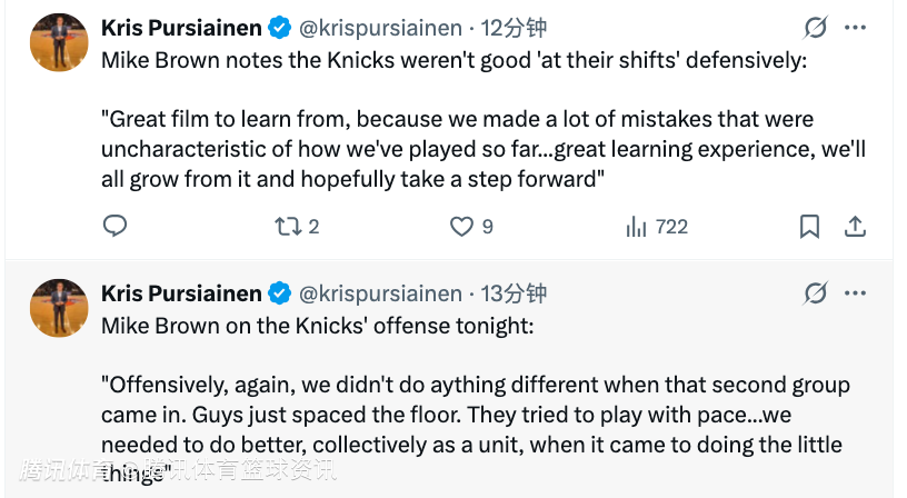 同时,布朗指出尼克斯在防守换防方面表现不佳:“这是很好的学习素材,因为我们犯了很多不符合我们目前打法风格的错误,这是很棒的学习经历,我们都会从中成长,希望能借此更进一步。”