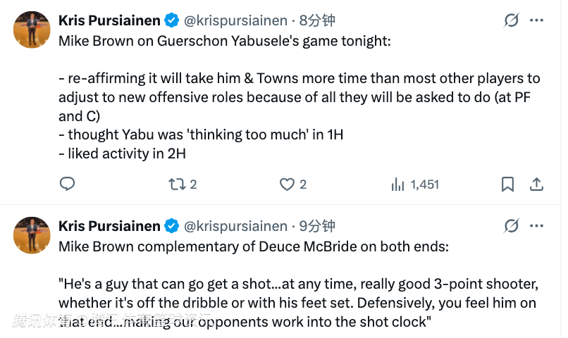 谈及亚布塞莱,布朗表示:“再次强调,由于在大前锋和中锋位置上需要承担的任务,他和唐斯适应新进攻角色的时间会比其他大多数球员更长,他上半场想的太多了,不过下半场我喜欢他的积极性。”此役亚布塞莱首发出战23分钟,8投4中拿到11分5篮板2助攻。