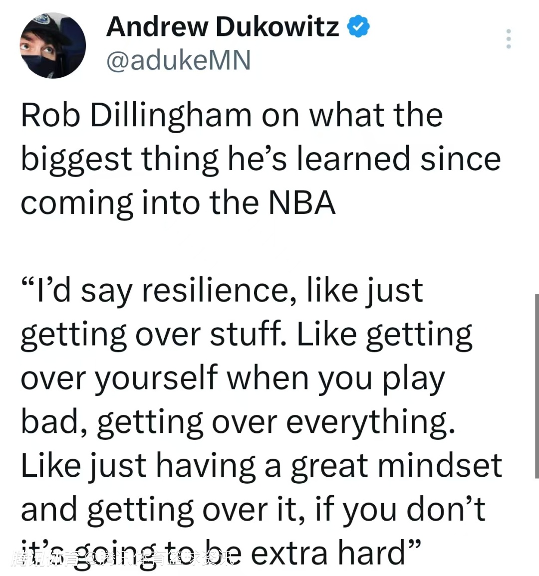 关于进入NBA后最大的收获,迪林汉姆表示:“我觉得是韧性,也就是学会翻篇。比如打得不好的时候要放下自我,抛开所有不顺心的事。必须保持强大的心态,学会向前看,不然日子会难过得多。”