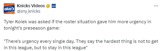当被问及球队阵容情况是否让他在今晚的季前赛中更具紧迫感时,科勒克表示:“每一天都充满紧迫感。有人说,在这个联盟里,最难的不是进入联盟,而是留在联盟。”