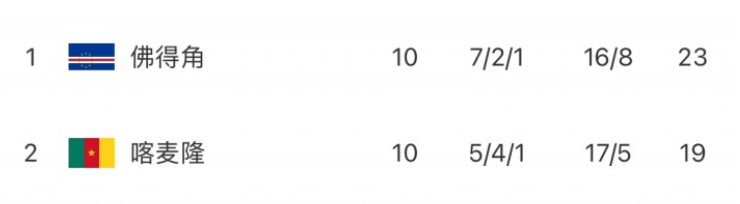 最终10轮战罢,佛得角进16球丢8球、7胜2平1负积23分昂首进军美加墨,喀麦隆进17球丢5球、5胜4平1负积19分排第二。在直接对话中,首回合喀麦隆主场4-1大胜佛得角,但次回合客场0-1不敌佛得角。