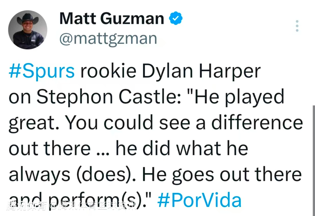 迪伦-哈珀在谈到本场伤愈复出的卡斯尔的表现时说道:“他打得很棒。你能看出场上的变化,他做了他一贯做的事,他上场后就全力发挥。”卡斯尔此前在球队队内对抗赛中受伤,伤愈回归后他出战19分半,全场12投5中,其中三分4中2,罚球5中2,得到14分3篮板4助攻3抢断1盖帽。